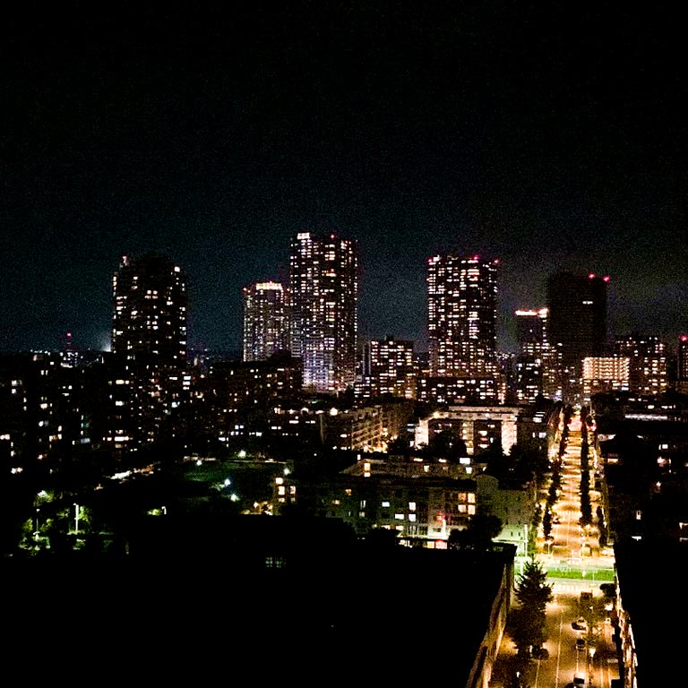 都会的で洗練されたスカイラインが、夜には光のアートに